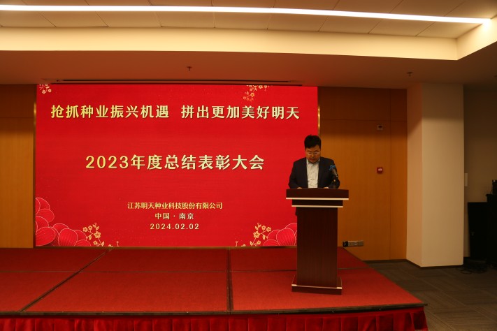 春耕夏耘,秋收冬藏”,22日江蘇明天種業全體人員齊聚南京圣和文化交流中心隆重召開2023年度總結表彰大會。公司全體領導班子成員、2023年度先進和優秀員工代表及子公司員工等160余人參加了會議,會議由公司副總經理胡玉成主持
